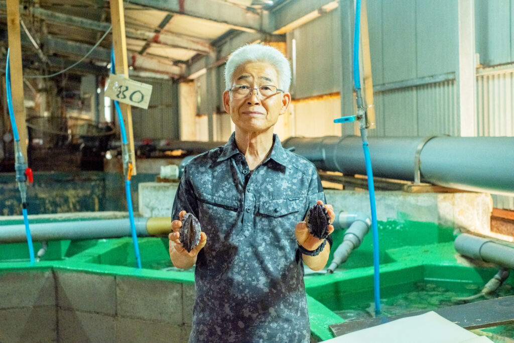 飼育水槽にはいくつかの種類があり、7m水槽が26基、6m水槽が16基、選別用水槽が7基、出荷専用水槽が5基の計54基を使用しています。その水槽を利用することで、毎年9万個~11万個の蝦夷アワビが育ち、出荷されていきます。